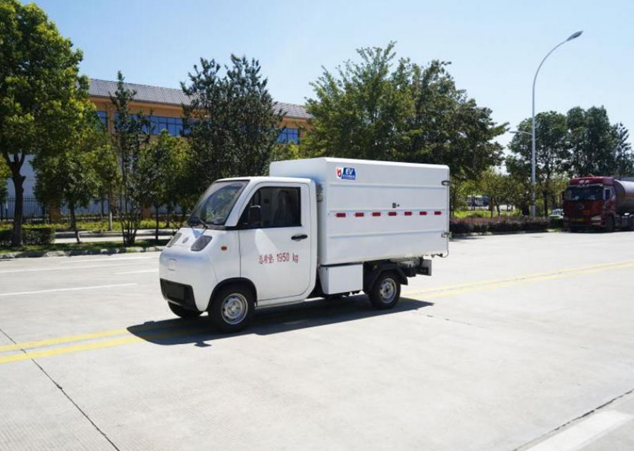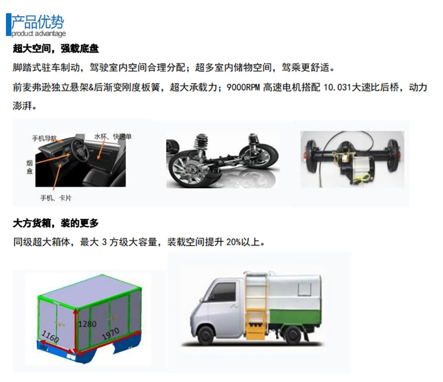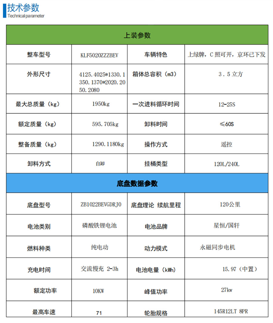 该车专用装置主要为垃圾箱和提升机构,用于垃圾的收集和清运;储能装置单体种类/储能装置单体生产企业/储能装置总成生产企业:磷酸铁锂动力蓄电池/合肥国轩高科动力能源有限公司/合肥国轩高科动力能源有限公司;驱动电机类型/型号/生产企业/额定功率(kW)/峰值功率(kW):永磁同步电机/TZ170XZD3/江苏一东航空机械有限公司/10/27;ABS型号/生产企业:RL-102/温州瑞立科密汽车电子有限公司;该车型可选装直接供电ETC车载装置;该车整备质量不包含备胎,包含随车工具等.货箱重量为400kg,底板材质为Q235钢,厚度为2.5mm;侧板材质为Q235钢,厚度为1.5mm;顶盖材质为Q235钢,厚度为1.5mm.选装轮毂装饰罩,选装黑色轮毂,选装不同颜色前保险杠.