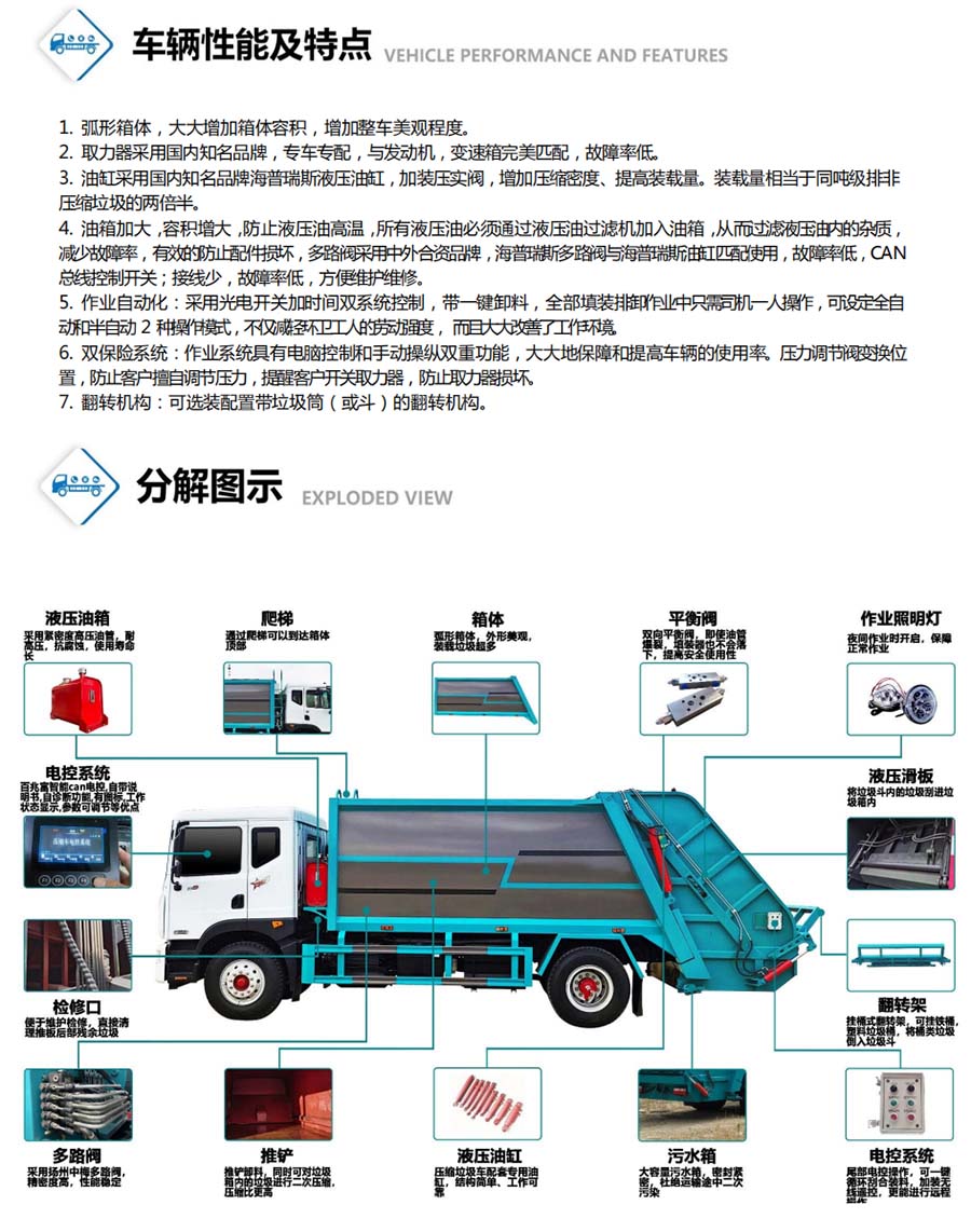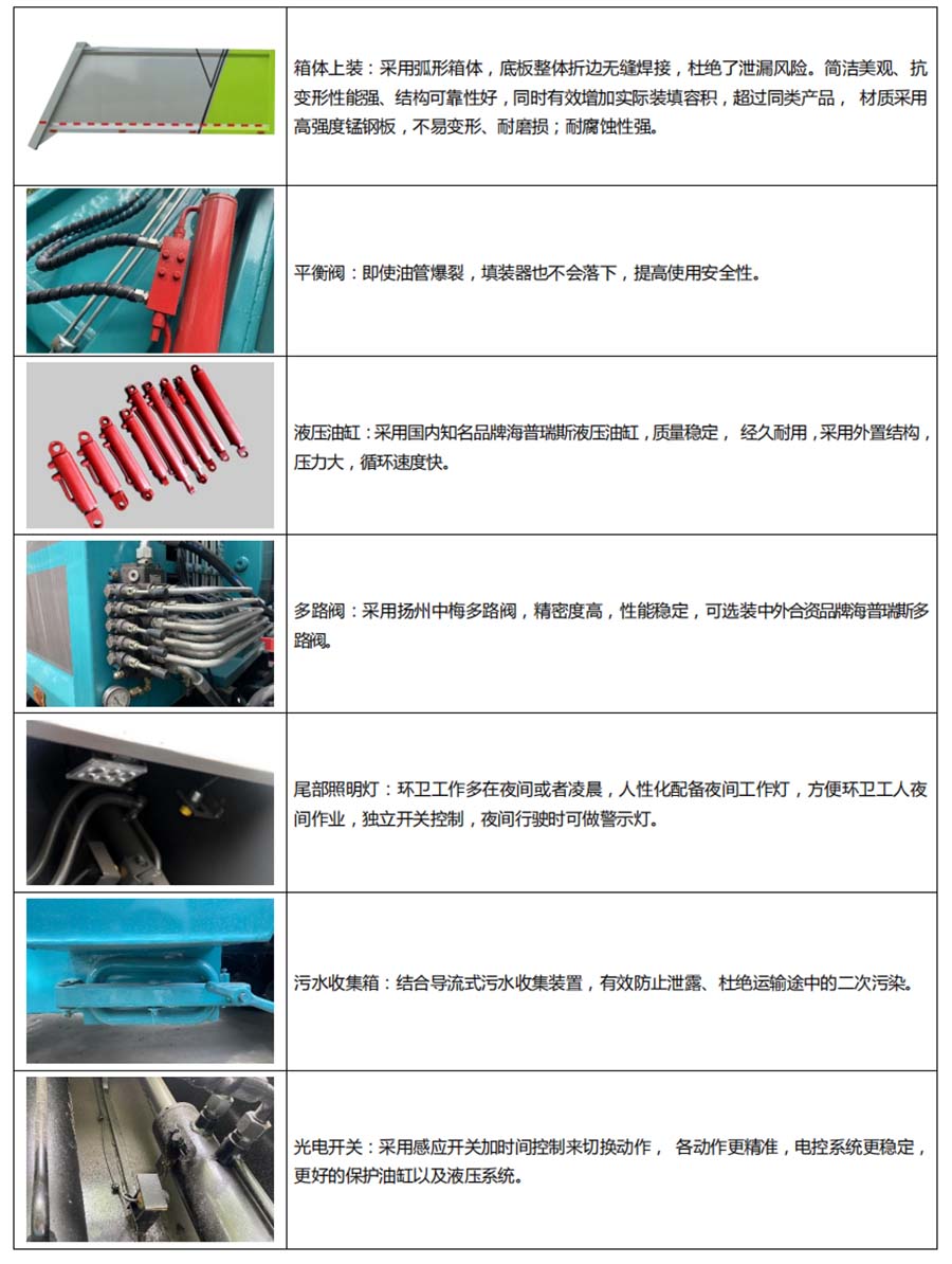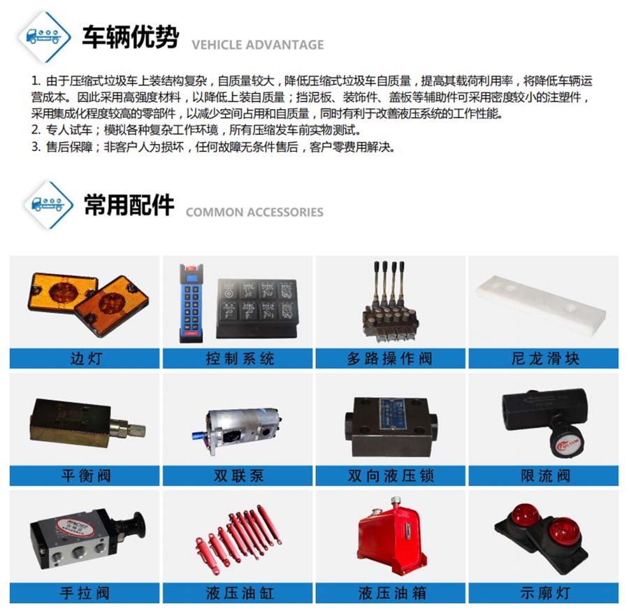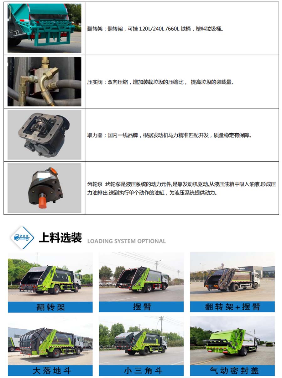 | 其他 | 1、随底盘选装驾驶室,可选装尾部翻转机构样式。 2、仅选用3308mm轴距,该车后伸为555mm。3、防护材料:Q235B碳钢,连接方式:左右侧面防护采用焊接连接在副梁上,后部防护由专用装置代替豁免,最小离地高度为490mm.。4、ABS型号/厂家:ABS/ASR-12V-4S/4M/襄阳东风隆诚机械有限责任公司。5、发动机型号与油耗值对应关系为(L/100km):D20TCIF1/16.2,YCY24140-60/16.2,CA4DB1-11E6/16.2,ZD30D16-6N/16.2,CY4BK461/16.2,CY4BK161/16.2。专用装置:液压机构和填塞器,主要用于城镇环卫垃圾的运输。 | ||